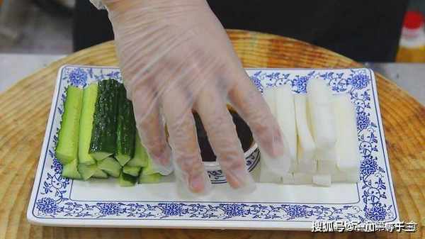 黄瓜一根同样切成条与白萝卜条一起放在盘中。