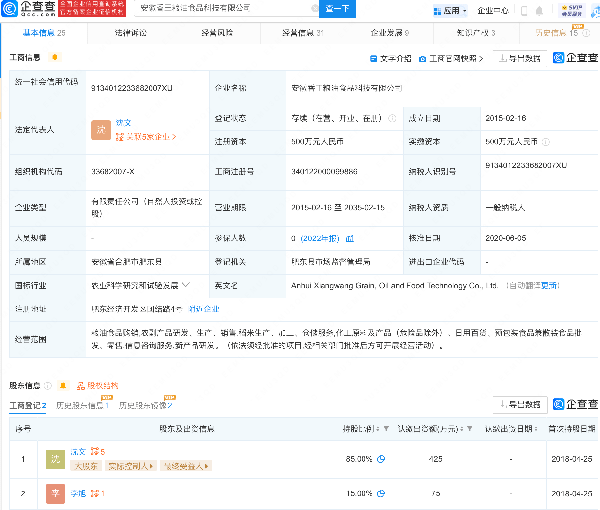 企查查APP显示,渉事公司之一安徽香王粮油食品科技有限公司成立于2015年,法定代表人为沈文,注册资本500万元人民币,经营范围包含:粮油食品购销;农副产品研发、生产、销售;稻米生产、加工、仓储服务等,由沈文、李旭共同持股。企查查信息显示,该公司食品生产许可证(证书名称:大米(分装))已于2017年12月失效。