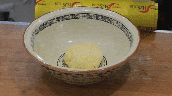 用120毫升的温水和面,边倒边搅拌,水不要加多,因为玉米面粘性很小,不吸水,水放多的话,和出的面会非常的稀,然后 我们把面絮揉成 软硬适中的 光滑面团,用保鲜膜盖住,密封发酵40分钟~