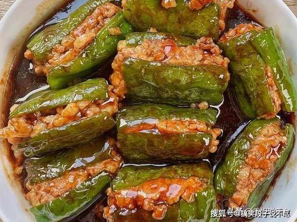3、青椒清洗干净切成段,去掉辣椒籽,再塞入腌制好的肉末。锅中油热放进去煎煮,煎至虎皮状,就可以倒入酱汁焖煮一下。