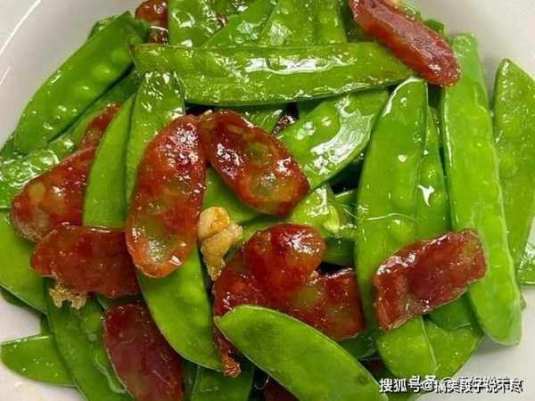 1、荷兰豆去掉老筋,清洗干净沥干水分。腊肠斜切成片,蒜切成末。