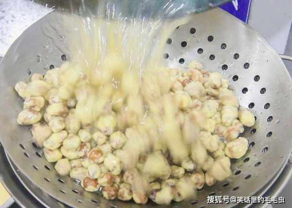 锅内烧油,油温3成热,油面平静不冒烟,把花生倒在漏勺里面抖掉多余的淀粉,倒入油锅里面,保持小火浸炸,让热力慢慢地渗入到花生里面,期间要经常翻动让花生均匀受热,慢慢地升高油温。