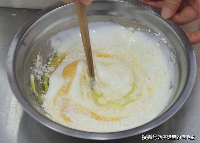 盆中打入2个鸡蛋,加入白糖10克,面粉50克,倒入250毫升的酸奶,搅拌成细腻的酸奶糊备用,酸奶糊中不要有面疙瘩,会影响成品的口感。