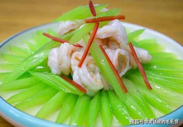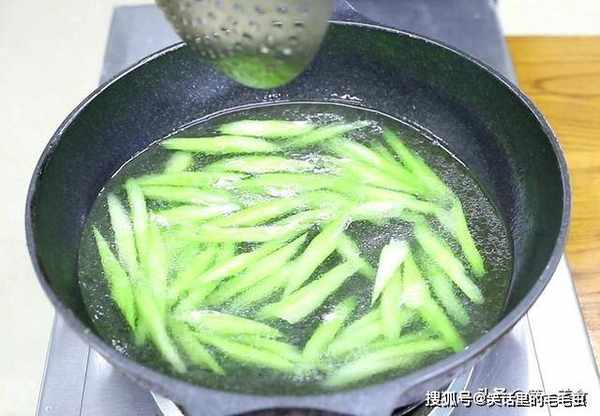 锅内烧水,加入少许食盐和植物油,把芹菜段倒进去快速焯煮一下,大约20秒钟,芹菜返青以后立即捞出,快速用凉水清洗几下,保持清脆的口感。