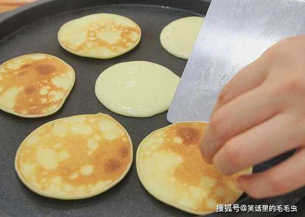 把电饼铛烧热不用刷油,挖一勺酸奶糊倒入锅中,摊成薄厚均匀的圆形小饼,保持小火烙2分钟,酸奶糊全部定型以后翻面,翻过来之后再烙1分钟,另一面也呈金黄色时即可出锅。