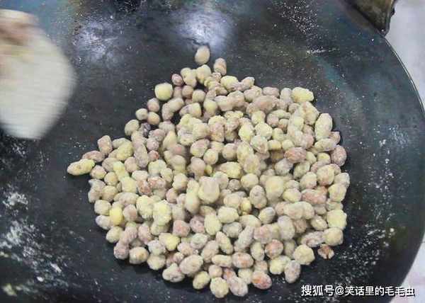 利用余温不停地翻炒,随着温度的下降锅中会出现白色的糖霜,继续炒至花生表面干燥,粘稠的糖汁就变成了糖粉,糖霜就挂好了。