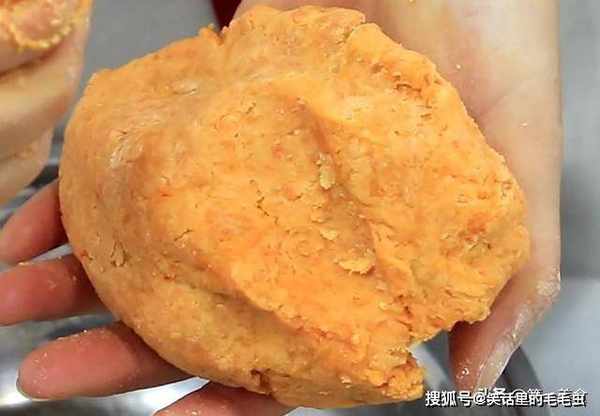 15分钟以后把红薯块取出放在小盆中,倒入白糖10克,增加红薯的甜度,用小勺子把红薯块按压成红薯泥,倒入一些淀粉,和成红薯面团。