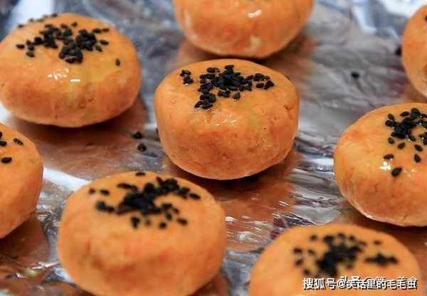 取出烤盘放一张锡纸,在锡纸上面刷上植物油,把红薯芝士饼摆放在烤盘上面,刷上一层鸡蛋液,撒上一点黑芝麻来点缀,刷完一面翻过来,另一面也刷上鸡蛋液,撒上黑芝麻来点缀,放进烤盘中,180度的温度烤20分钟。