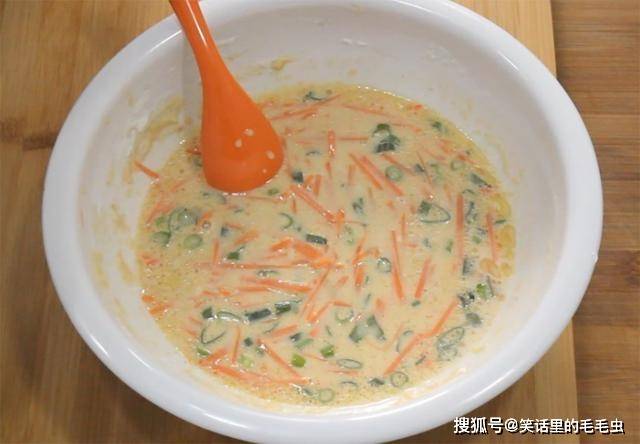 倒入准备好的葱花、胡萝卜搅拌均匀备用。