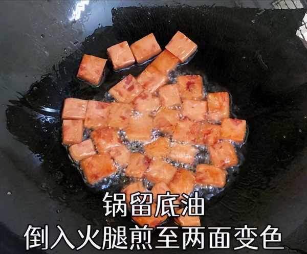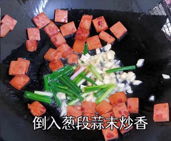 6:锅底留一些食用油,锅底铺一些火腿肉,两面都煎至两面变色,火腿肉推在一边,加上一些葱花和蒜末爆香。