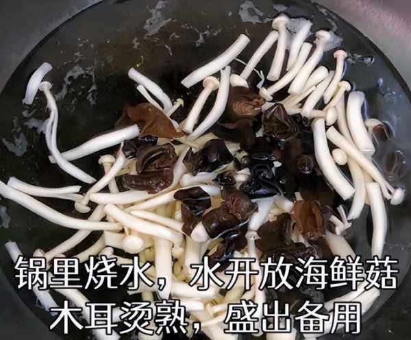 2:黑木耳用温水泡发变软,切除黑木耳的根蒂,起锅煮一些清水,黑木耳和白玉菇倒入锅中,将两者煮几分钟,盛出用凉水浸泡一会儿,控干水分。