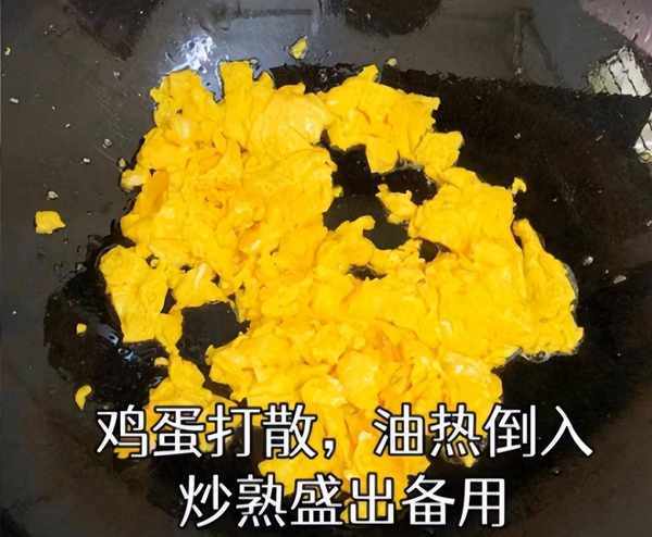 5:锅中加上适量食用油,油温烧热后倒入蛋液,蛋液用中小火煎至成型,快速将鸡蛋炒散,装盘备用。