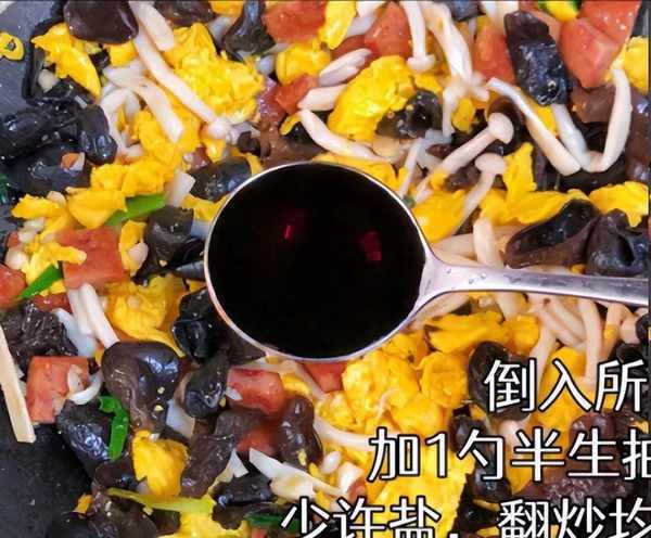 7:倒入一些黑木耳和白玉菇,将菌菇都炒至变软,最后倒入提前炒熟的鸡蛋,用锅铲快速翻炒均匀。