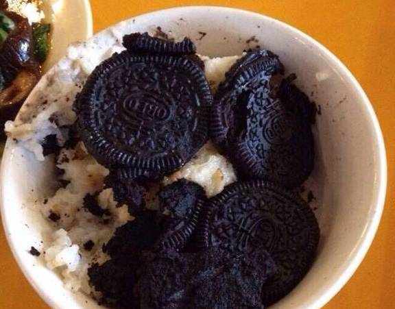 第八个是奥利奥牛奶拌饭,将牛奶、奥利奥饼干放在一块来煮饭,嗯,如果吃这个甜甜的料理,吃完一定不会饿了!