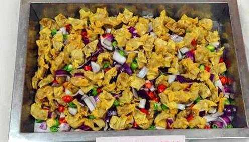 第六个是月饼炒辣椒,大概是中秋节剩下的月饼,然后被学校食堂做成了新的黑暗料理月饼炒辣椒,做出来到底是辣的还是甜的呢?