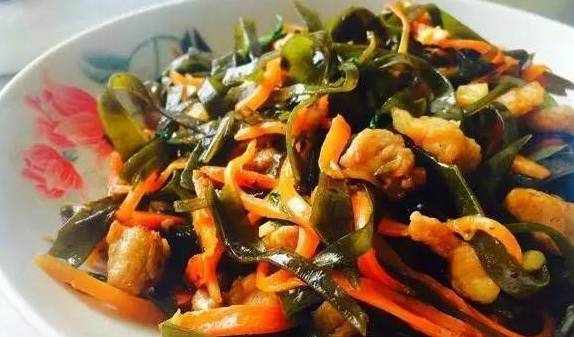 7、最后加入海带,翻炒均匀后出锅,美味的五花肉胡萝卜炒海带上桌啦。