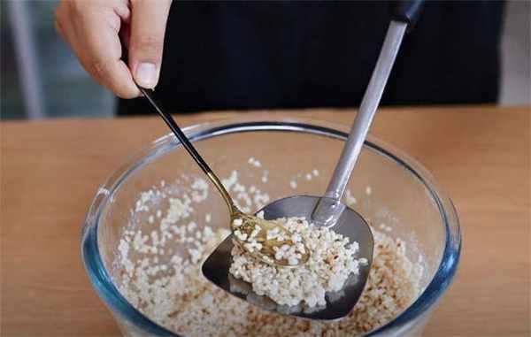 5.油温烧到放进去糯米它可以浮起来的程度就可以了,拿个干燥的铲子在锅里面转两下预热,然后在上面铺上一层糯米。