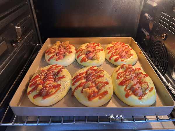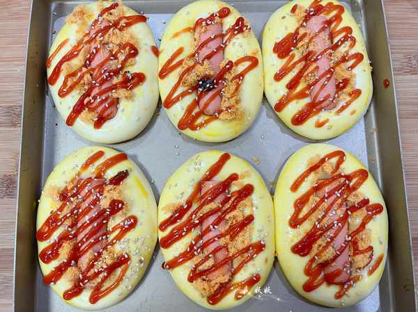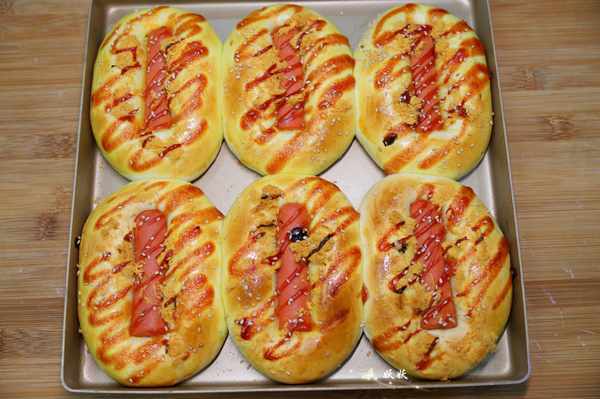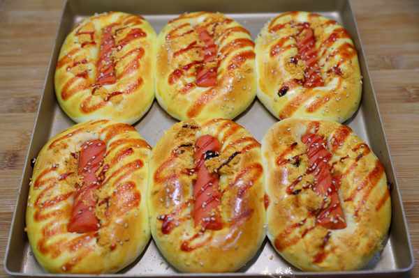 6,用羊毛刷沾一层鸡蛋液轻轻刷在面包表面,撒上肉松,挤上番茄酱,根据自己的口味可以再撒一些熟芝麻。