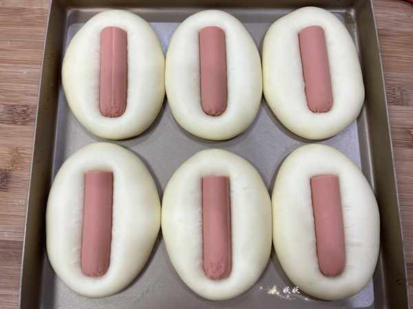 5,置于温暖湿润处,让面团发酵,大约发酵至原来的1.5倍到2倍大,把火腿肠切成合适的大小,按压进面团中间。
