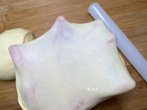 2,看到面团成型,且稍微光滑后,就可以放入黄油和盐了,这两样食材后放,有助于面筋的形成,继续用厨师机揉面,把面团揉成图中能拉出手套膜的状态。