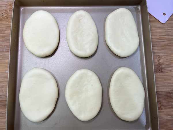 4,分别把每块面团擀成椭圆形,稍微有点厚度,不要太薄了。我用的模具是28乘28的金色方盘。