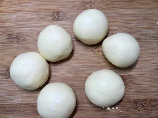 3,把面团分割成六等份,分别滚成圆形,可以用反复折叠的方法,这样做出来的面团表面光滑,还不会破坏面团的面筋。