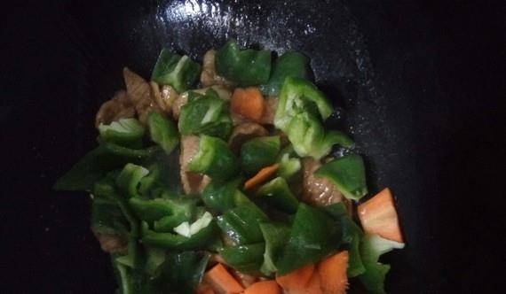 7.下青椒和胡萝卜,翻炒,干的话再加水。加一点盐,准备起锅