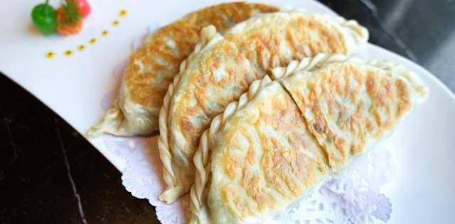 第五步:将饺子皮擀薄,取适量的馅料放在一半的饺子皮上,摊开均匀,盖上另一半,压紧。