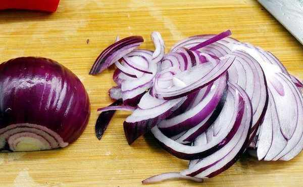 将准备好的洋葱去掉外皮,去掉外层的两层。准备一把干净的刀,蘸上清水,确保刀后有水,将洋葱切成大块。