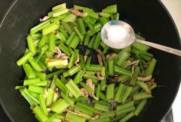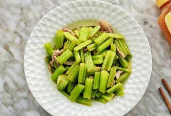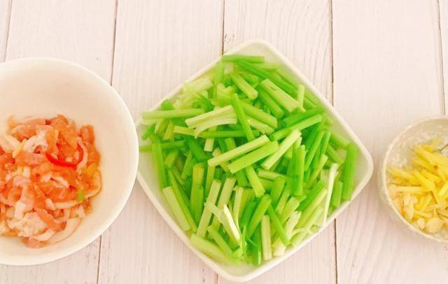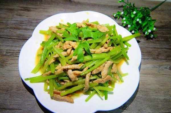 原料:芹菜、猪肉、姜丝、盐、酱油、油。练习步骤: