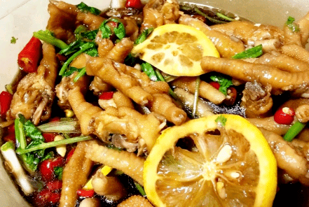 接着在锅里放入适量色拉油烧热,在鸡脚的头上放一些干辣椒,把油淋上去。最后再切点柠檬点缀一下就完成了。