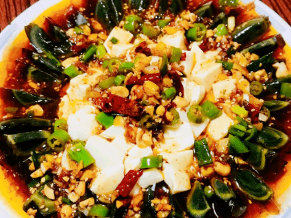 凉菜很讲究摆盘,切好的皮蛋顺着盘子的边上摆一圈,把内酯豆腐,用勺子挖出来,摆在盘子的中间,然后取一小碗,在碗中加入上述的调料,除了小葱,搅拌均匀,然后均匀的淋在皮蛋和豆腐上,最后再加入小葱点缀一下即可。