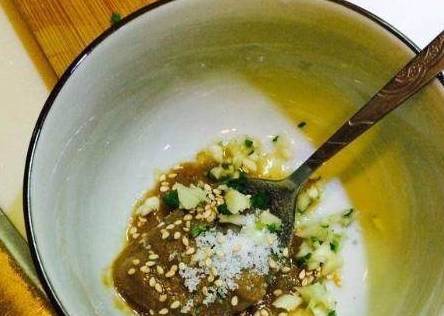 4、用白糖、芝麻油、花椒油、蒜末、盐拌匀,就可以开吃了。如果比较讲究的可以放在一个小碗里压一下造型,可以了买点杏仁拌起来吃。