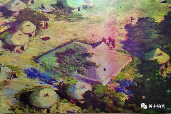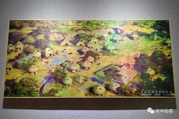 目前,在西安半坡博物馆遗址保护大厅内,可以看到当年发掘出来的各式各样的房屋、灰坑、窖穴、壕沟、小沟等众多的遗迹。但是,怎么不见“大房子”的身影呢? 2023 年 1 月 20 日,我在西安半坡博物馆遗址保护大厅内参观时,偶然看见墙壁上悬挂的半坡村落模拟复原图。其中,清晰地描绘了“大房子”的位置和外观。