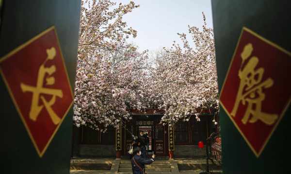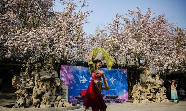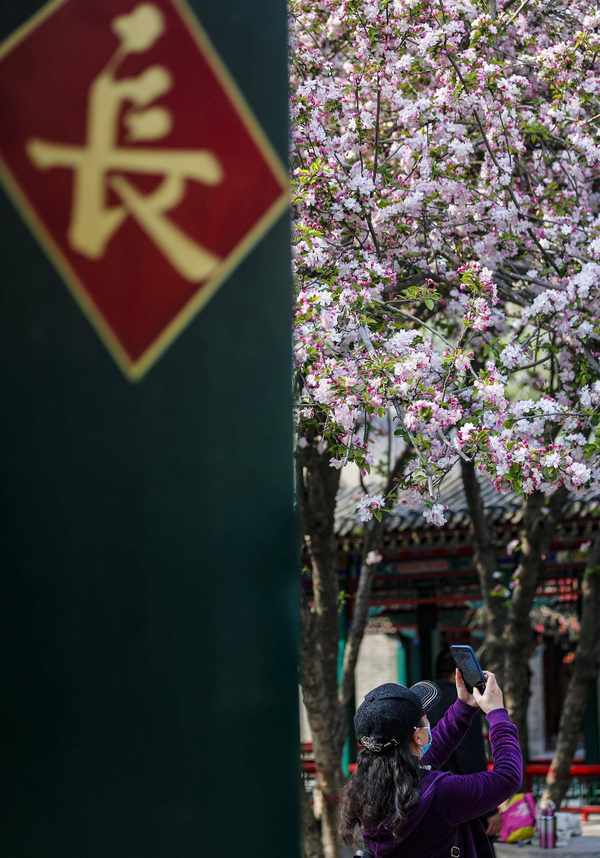 春回大地,百花齐放。4月5日,清明假期,在位于河北省正定古城的荣国府内,海棠、丁香、碧桃和紫荆等花朵,竞相开放。古城与春色,在这里碰撞出如梦如幻的风景,吸引了众多游客前来游玩。图为,一位游客身穿汉服,在海棠花下翩翩起舞。