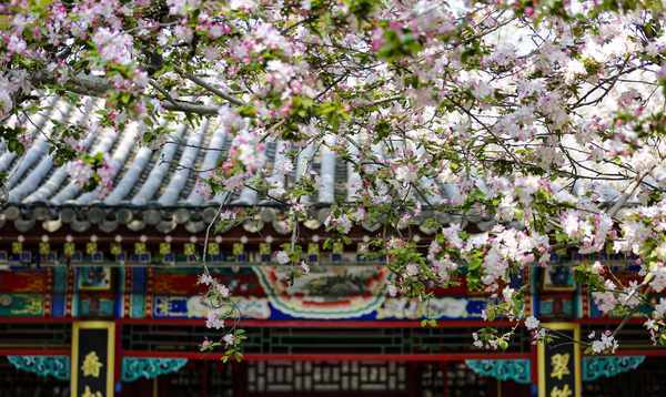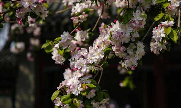 这里的西府海棠花在初开时,花苞似如胭脂,之后转入淡淡的粉色。