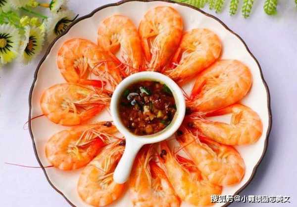 第三步:煮至虾身弯曲,颜色变红,关火,捞出冷水快速装盘,姜末加入香醋和香油调味,去皮将虾肉放入酱汁中,非常鲜美可口。