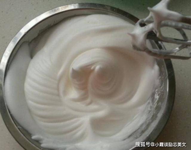 2、然后第二次加入三分之一的白砂糖,打至湿沫状态,最后加入剩余的细砂糖,最后打至干沫状态,即提起打蛋器,直立的三角形。