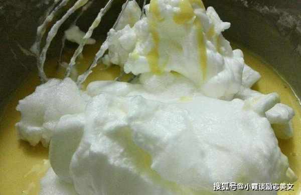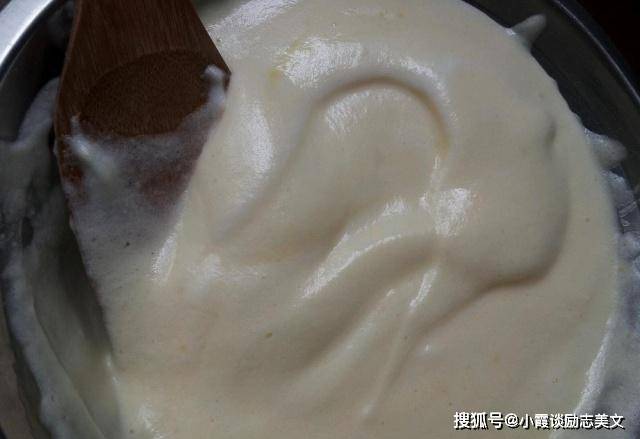 4、然后将打发好的蛋白霜的三分之一加入打散的蛋黄中,搅拌均匀。一定要像炒菜一样搅拌。不要搅拌,否则容易消泡。搅拌均匀后,倒回蛋清,拌入釉料至顺滑。