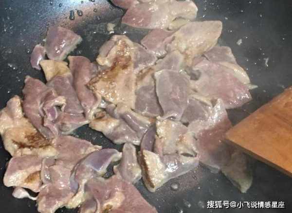 第六步:然后倒入腌制好的猪肝,搅拌至猪肝变色,加入适量生抽拌匀。