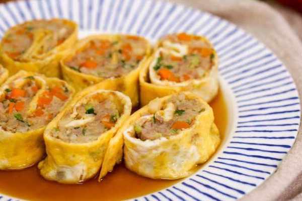 第三步:将肉馅均匀铺在煎蛋上,左右两边向内折叠,从下往上卷起,放入蒸锅,冷水蒸,中火蒸20分钟。煮沸后,蒸好取出,稍凉后切成片即可食用。