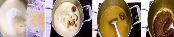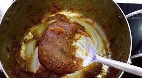2、然后将雪梨汁倒入锅中,加入一个掰碎的罗汉果和冰糖,一边煮一边用锅铲不停地搅拌,直至冰糖溶化,当锅内的梨汁开始变得粘稠时,用筷子夹出罗汉果及其果壳,调小火,继续熬,熬至非常浓稠,不会流动的状态;