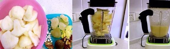 1、首先准备好所有原材料,雪梨去皮去核,切成块;将雪梨放入破壁机中,加入生姜红枣,以及川贝、杏仁、茯苓、陈皮等中药材,选择果汁键,一起破壁打成汁备用即可;