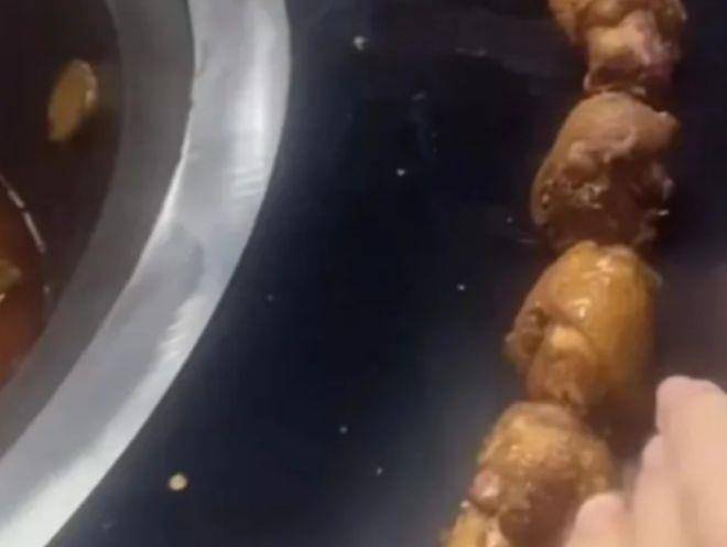 江苏宿迁,男子请朋友们吃地锅鸡,结果一个锅里夹出16段鸡脖子,摆起来约有1米长!男子觉得不可思议,怀疑这鸡脖子是老板把别桌吃剩下的混进去充数!老板却说:这很正常,因为两只鸡比较大,能切出这么多鸡脖子是常见的![微风]