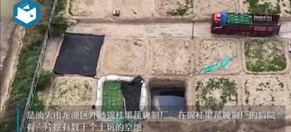 在潮汕区,好多企业都生产腌制菜,汕头市龙湖区外砂锦桂果蔬腌制厂后院有一片挖有数十个土坑的空地,生产场地有许多工人穿着长筒水鞋,在坑里坑外来回的走来走去,没有经过任何的清洗和消毒。甚至有的工人一边抽油,一边随意向腌制芥菜的土坑中吐不明物体。