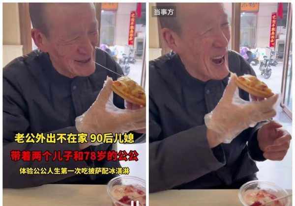 90后儿媳带着公公去吃他年轻时候不舍得吃的凉粉,带着公公体验人生第一次吃披萨配冰激凌,吃绝味鸭脖,公公满心欢喜,每天都是高兴的合不拢嘴。