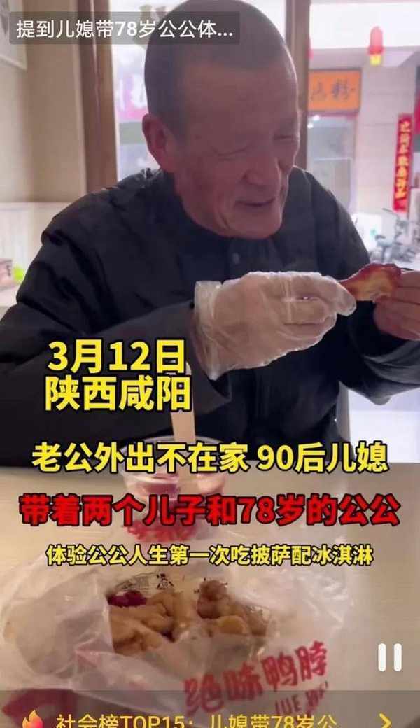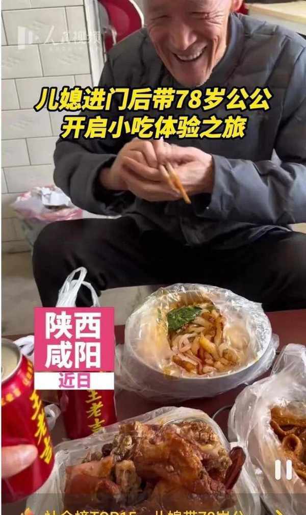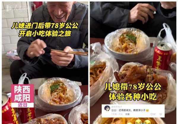 近日,在陕西咸阳,由于公公上了年纪,平时又舍不得吃喝,加上老公经常外出不在家,90后儿媳就带着公公体验吃香得喝辣得。