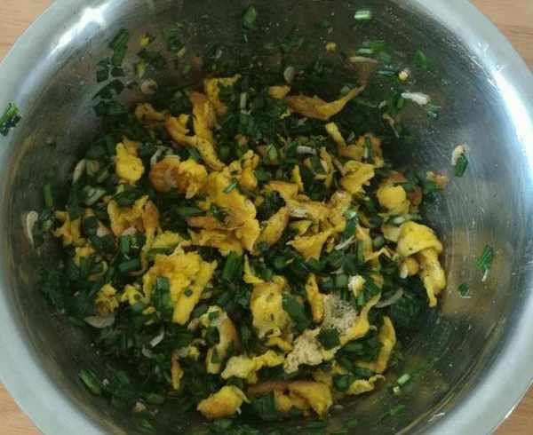 第二步:将韭菜摘洗干净,晒干备用;将鸡蛋打入碗中搅拌均匀,锅烧热,倒入少许油,油热后加入蛋液,炒至定型,快速搅拌放凉待用;将干韭菜切块,倒入香油拌匀,再加入葱花和冷却好的鸡蛋块拌匀,加入适量的盐、鸡精、蚝油朝一个方向搅拌。