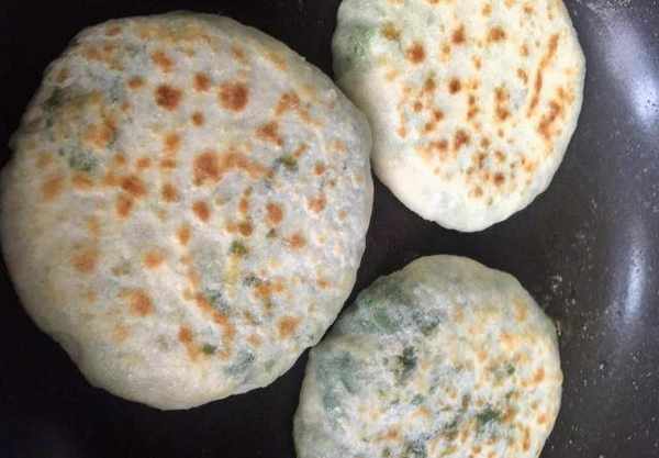 第四步:平底锅烧热,刷少许油,将生胚放入锅中,轻轻压平,在蛋糕表面刷一层油锁住水分,小火烘烤温度。加热至底部呈金黄色翻面,继续烤至另一面微焦,如此反复翻面,最后烤至两面金黄蓬松。