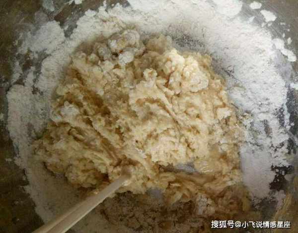 Step3:最后倒入适量的面粉,边倒边搅拌至呈粉状,揉成光滑的面团,盖上保鲜膜静置20分钟。